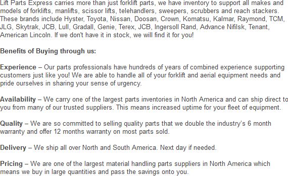 We offer you the best deals on all parts for your fleet of forklifts. Phone today to get a quote on one of the attachments or parts we offer. Call us at: